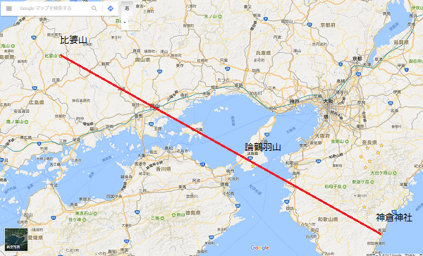思いついた関連がありそうな聖地を結んでみたら、やっぱり一直線です。